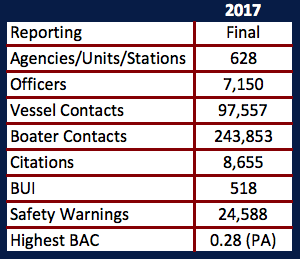 (Nov. 7, 2017 – Lexington, KY) During the annual three-day heightened awareness and enforcement Operation Dry Water weekend, hundreds of local, state and federal law enforcement agencies made 518 boating under the influence arrests nationwide.