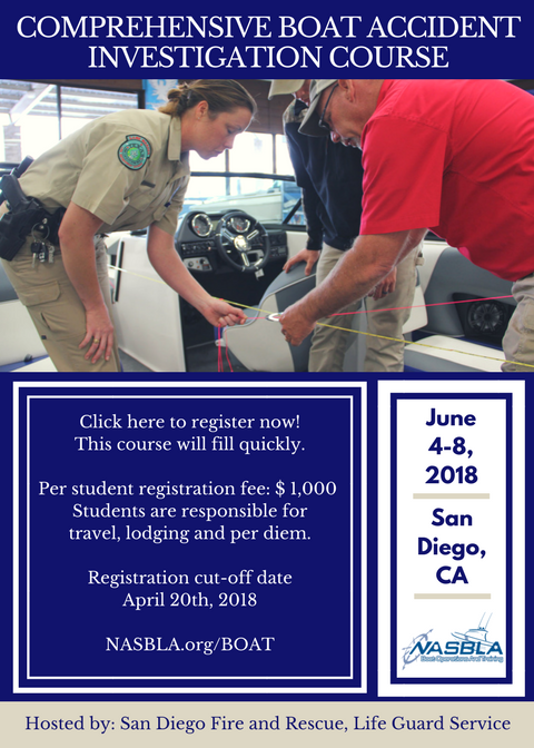 NASBLA's Boat Operation and Training (BOAT) Program will be offering a tuition based Comprehensive Boat Accident Investigation course in San Diego, California, June 4th – 8th, 2018. The course is being hosted by the San Diego Fire & Rescue, Life Guard Service.